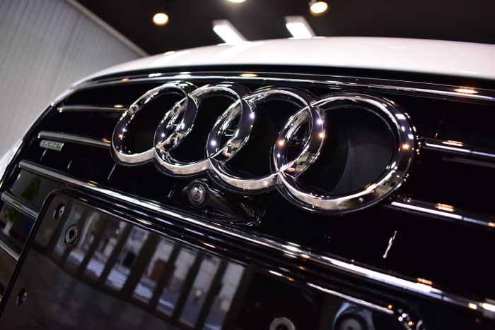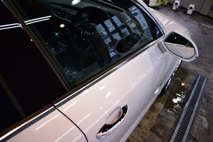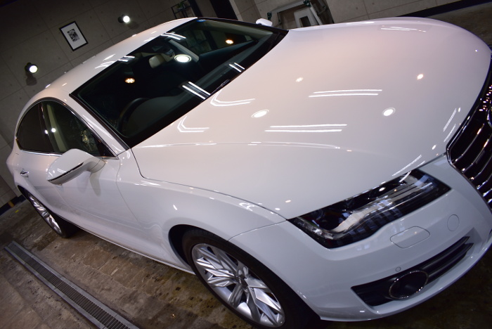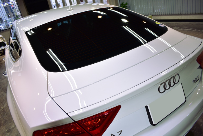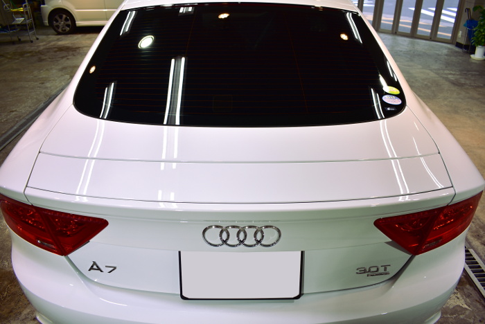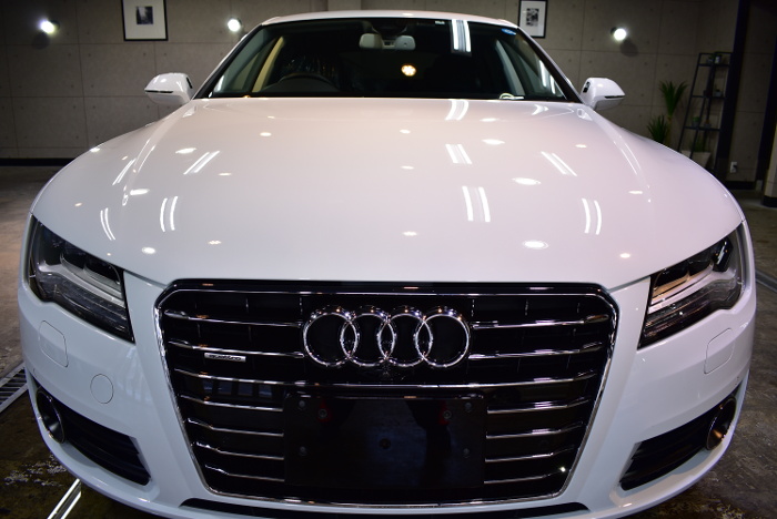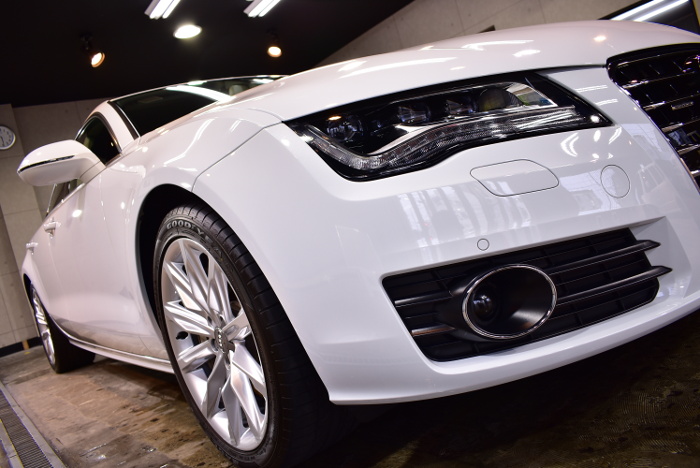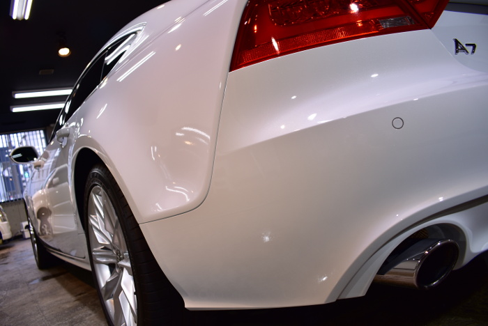 さて、アウディA7スポーツバックは、美しいフォルムを持つ4ドアクーペで、外観優先なのかなと思いきや、前席はもちろん、後席および荷室の余裕は圧巻、300ps超のエンジンとquattroシステムによる走行性能にも言うことなく、フォーマルユースにも使えるドライバーズカーと言えるオールマイティーな高性能車で、オーナー様のご要望にピタリ嵌ったとのことでした。ご入庫のお車は初度登録平成25年1月の経年車ですが、販売店様の保管状況及び納車前メンテナンスが良かったと思われる上、ボディカラーがホワイトということもあり(ホワイトは傷が目立ちにくい!)一見したところ傷は殆ど見当たりませんでした。とはいえ、コーティング専門店である当店の高輝度LED照明のもとで細部をチェックしていくとやはり細かいスクラッチ傷は確認されました。洗車、各ヒンジ部等細部の汚れ除去、鉄粉処理の後、リボルト・ライトコースに対応したポリッシングを行い、浅いスクラッチ傷を除去、脱脂洗車の後、ガラスコーティングという流れで作業を行いました。リボルト・ライトコースで用いるコーティング剤は、当店で実施しているすべてのコーティングコースの表面被膜を形成するもので、完全無機質な被膜特性を持ち、一般的な石油系溶剤のコーティングと比較して数段上の被膜性能を誇っており、UVカット機能により紫外線からも車体を守ります。