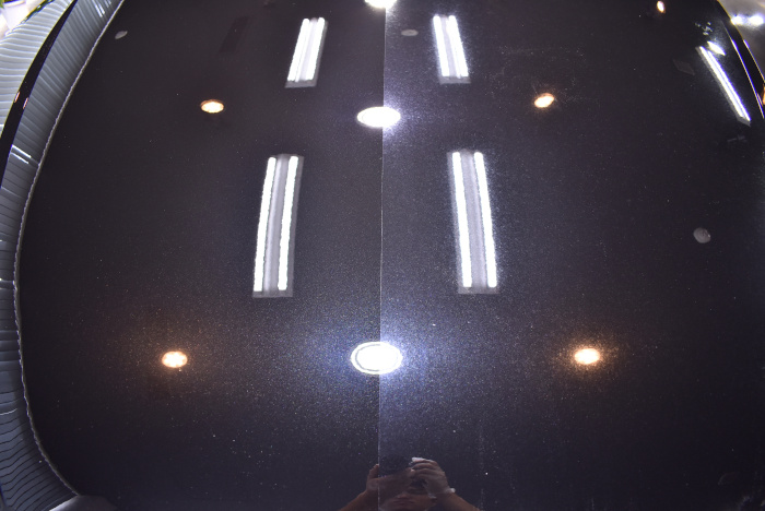 ●ボンネットの研磨前後の写真(右半分:ビフォー、左半分:アフター)